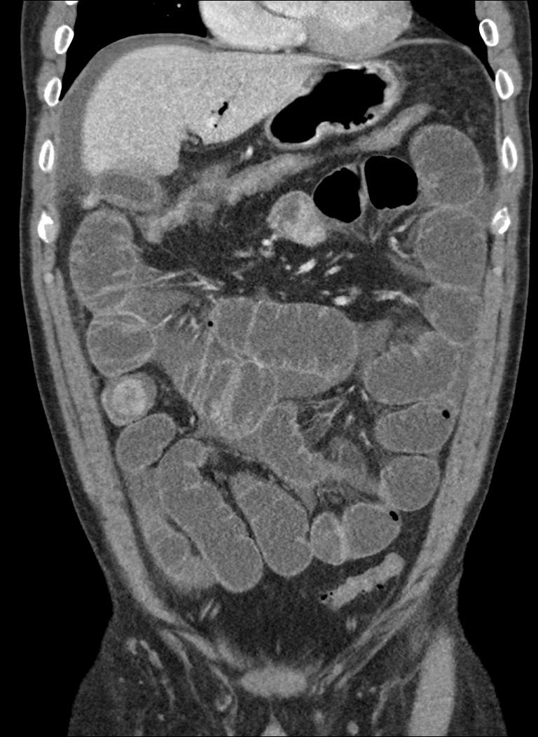 Een 54-jarige man komt op de Spoedeisende Hulp met progressieve buikpijn en braken sinds 5 dagen. Sinds 3 dagen heeft hij geen ontlasting meer. Bij lichamelijk onderzoek is de buik gespannen en bol en er is hoogklinkende peristaltiek. Laboratoriumonderzoek laat een leukocytose en licht verhoogde leverenzymwaarden zien. Er wordt een CT-scan van de buik gemaakt.