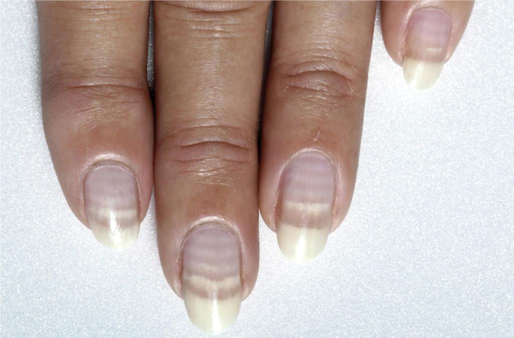 Een 50-jarige vrouw, was in ons ziekenhuis onder behandeling wegens een infiltrerend lobulair carcinoom (pT2N3M0) in de linker mamma, waarvoor zij op dat moment chemotherapie kreeg. Zij presenteerde zich op de polikliniek Chirurgie met multipele, niet wegdrukbare, transversale witte banden op alle nagels van beide handen, het nageloppervlak was glad.