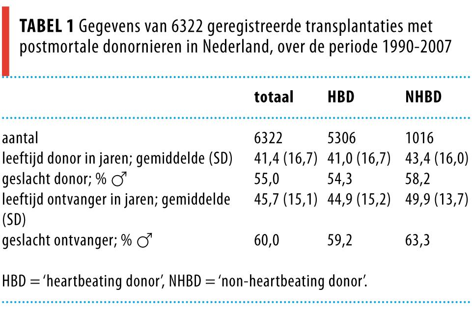 We gebruikten gegevens van de Nederlandse Orgaan Transplantatie Registratie, betreffende transplantatie van postmortale donornieren over de jaren 1990-2007.