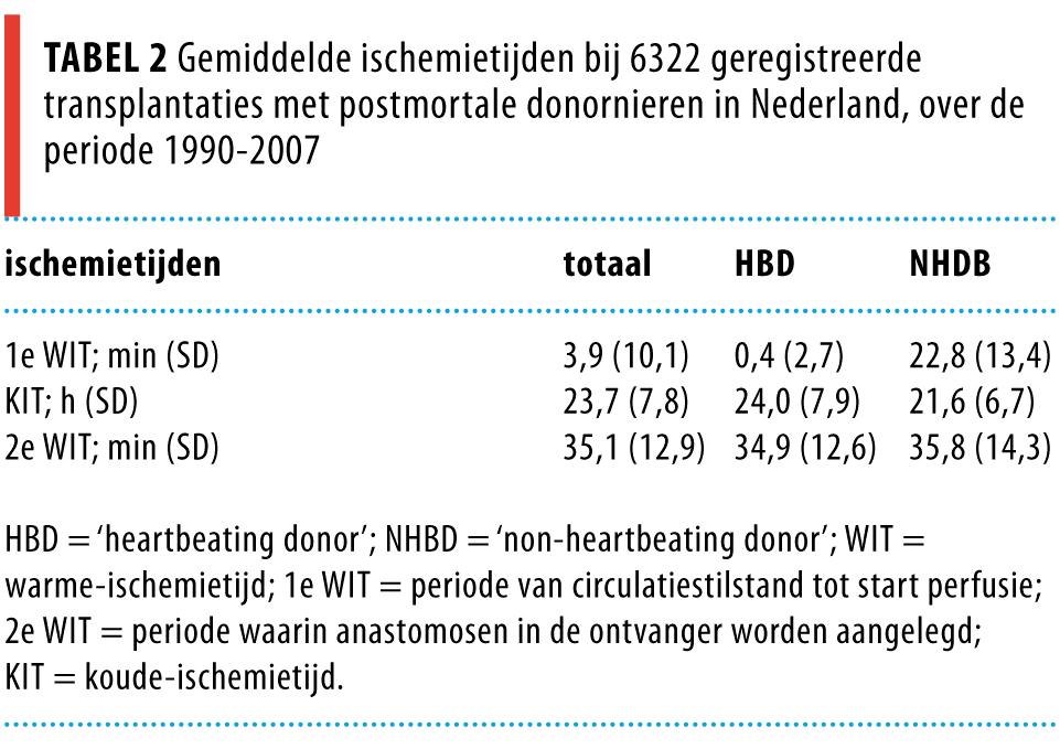 Een langere duur van de koude-ischemietijd is gerelateerd aan het vaker optreden van vertraagd op gang komen van de transplantaatfunctie en primair transplantaatfalen en aan een verminderde niertransplantaatoverleving. Deze uitkomsten onderstrepen de noodzaak om in de Nederlandse situatie te streven naar kortere koude-ischemietijden.