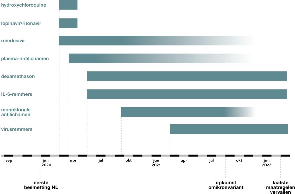 Na de uitbraak van de pandemie waren hydroxychloroquine, lopinavir/ritonavir en remdesivir de eerste middelen die werden ingezet bij covid-19. Al snel kwamen de eerste negatieve studieresultaten over deze middelen. Ze verdwenen dan ook uit de behandeladviezen, remdesivir als laatste. Dat zie je op deze tijdslijn, die is samengesteld op basis van een globaal literatuuroverzicht.