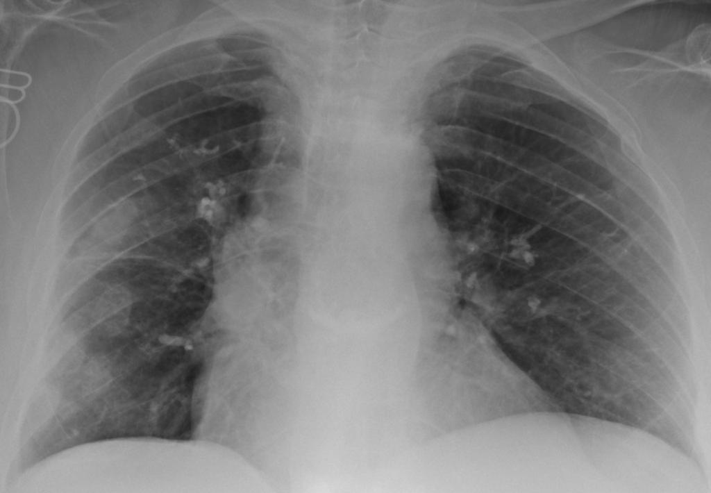 Een 59-jarige vrouw komt naar de Spoedeisende Hulp in verband met koorts en kortademigheid. Haar medische voorgeschiedenis vermeldt onder andere ribfracturen na een ongeval en inzakkingsfracturen. Op een röntgenfoto van de thorax zijn verschillende afwijkingen zichtbaar.