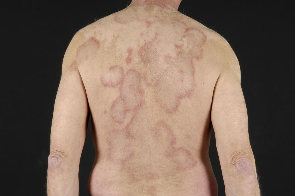 Een vrouw van 45 jaar had sinds een aantal maanden licht jeukende plekken op de romp, vooral op de rug. Sommige plekken waren inmiddels verdwenen, maar de bestaande plekken breidden zich nog langzaam uit.