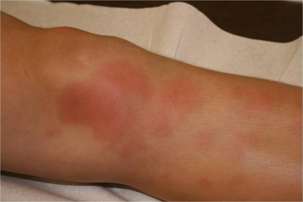 Een 13-jarige jongen presenteerde zich op de polikliniek Kindergeneeskunde met rode, pijnlijke zwellingen aan beide onderbenen sinds 3 dagen en koorts tot 38,6°C. In de voorafgaande 2 weken had hij veel diarree gehad. Bij lichamelijk onderzoek zagen we aan de ventrale zijde van de onderbenen warme, pijnlijke erythemateuze papels en noduli, deels confluerend, met een diameter van 1-6 cm (klik op de afbeelding voor volledige weergave). De dorsale zijden van de onderbenen waren vrij van huidafwijkingen.
