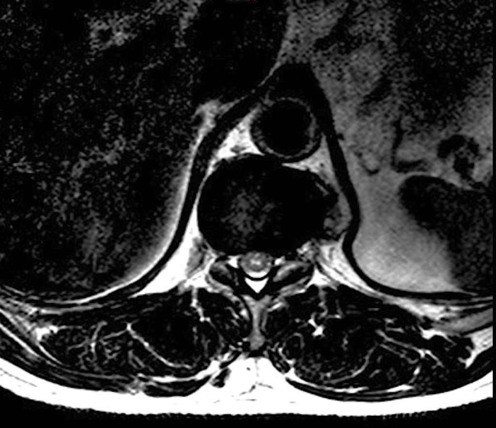 Een 61-jarige man met meerdere cardiovasculaire risicofactoren komt naar de SEH wegens acute rugpijn, gevolgd door een in uren progressief krachtverlies van beide benen, en darm- en blaasledigingsstoornissen. Bij onderzoek is de vitale sensibiliteit afwezig vanaf niveau T11, maar zijn de propriocepsis en vibratiezin gespaard. MRI van de thoracolumbale wervelkolom verricht na 24 h laat een langgerekte hyperintense T2-afwijking zien aan de voorzijde van het myelum op niveau T10-12. Een axiale opname toont dit beeld.