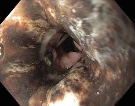 Een 85-jarige man komt naar de SEH vanwege toenemende pijn in epigastrio. Vlak ervoor heeft hij een zwarte vloeistof gebraakt. Daarnaast heeft hij melena gehad. Zijn voorgeschiedenis vermeldt hartfalen (door gedilateerde cardiomyopathie) en mitralisklepinsufficiëntie. Hij is nu hypotensief. Zijn Hb-waarde is 2,7 mmol/l, de ontstekingswaarden zijn hoog en er is sprake van acute nierinsufficiëntie. Oesofagoscopie toont dit beeld; de maag is niet aangedaan.