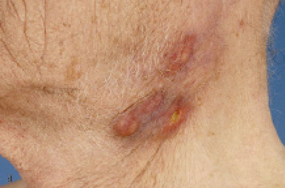 Een 79-jarige man had een rode zwelling onder zijn linker kaakhoek. De zwelling was ongeveer 4 bij 4 cm groot en was 2 maanden geleden ontstaan in Spanje. Daar had men de zwelling gepuncteerd, maar cytologisch onderzoek van het punctaat leidde niet tot een diagnose. Patiënt had verder geen symptomen. Wij zagen bij nieuw cytologisch onderzoek het beeld van een acute ontsteking.