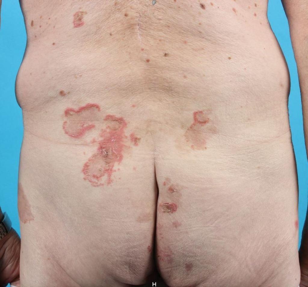 Een 81-jarige man komt bij de dermatoloog met caudaal op de rug, de billen en de benen geïndureerde erythematosquameuze plaques, met centraal opheldering en atrofie. Patiënt was in de laatste maanden 4 kilo afgevallen.