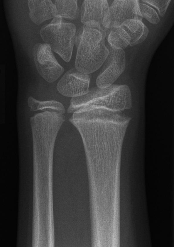 Een 11-jarige turnster kwam op de polikliniek Sportgeneeskunde, omdat zij sinds 1 jaar pijnlijke polsen had. Patiënte vertelde dat de pijn tijdens en na elke training optrad. Anamnestisch was er geen evident trauma bekend. Bij lichamelijk onderzoek zagen wij een niet-afwijkende stand van de polsen, zonder zwellingen of bewegingsbeperkingen. Alle weerstandstesten waren positief, maar de kracht was onverminderd.