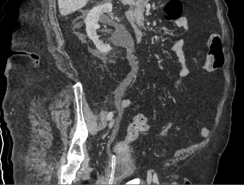 Een 68-jarige patiënte, bekend met recidiverende urineweginfecties bij een verblijfskatheter, wordt wegens koorts en pijn in de linkerflank opgenomen op verdenking van urosepsis. Zij wordt met antibiotica behandeld en de katheter wordt verwisseld. Na 5 dagen ontwikkelt zij plotseling hevige pijn in de rechterflank. Een CT-scan toont naast een hydronefrose nog een andere afwijking.