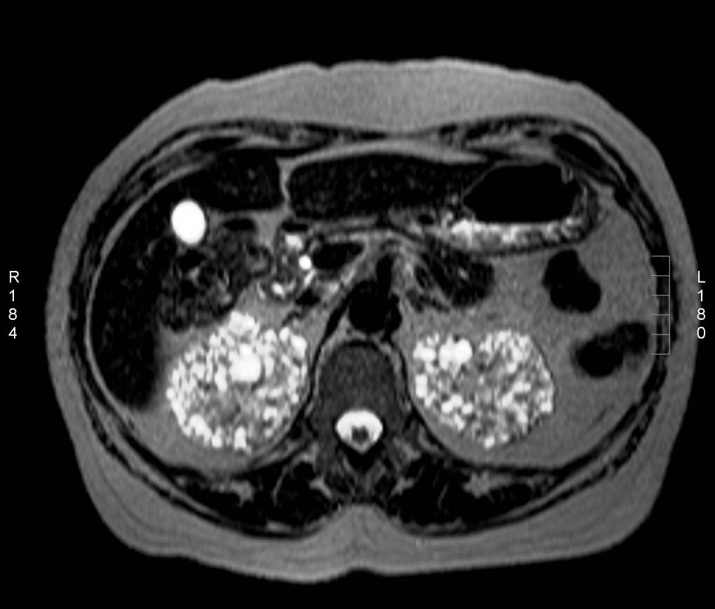 Een 57-jarige vrouw met hypothyreoïdie kwam ter controle op de polikliniek Interne Geneeskunde. Zij werd behandeld met levothyroxine. Verder had zij een bipolaire stoornis waarvoor ze al meer dan 15 jaar lithium gebruikte. Haar reeds bestaande nierfunctiestoornis verergerde: laboratoriumonderzoek toonde een serumconcentratie creatinine van 170 μmol/l en een geschatte glomerulaire filtratiesnelheid van 39 ml/min (volgens de ‘modification of diet in renal disease’(MDRD)-formule). Bij echografie zagen we multipele kleine cysten in beide nieren. De niergrootte was niet-afwijkend en er was geen stuwing te zien. Bij MRI-onderzoek werden in beide nieren zowel corticaal als medullair multipele cysten gezien, waarvan de meeste 1-2 mm groot waren (klik op de afbeelding voor volledige weergave).