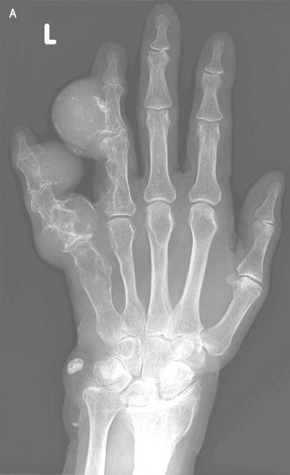 Een 66-jarige vrouw bezocht de polikliniek Orthopedie met enkele bolvormige, beenharde, pijnloze zwellingen aan de linker ringvinger en pink. Deze waren haar hele leven al aanwezig geweest, maar de laatste jaren waren zij duidelijk groter worden en gaven zij lichte bewegingsbeperkingen van de vingers. Daarnaast waren er multipele hemangiomen zichtbaar op haar linker voet, rechter hand en beide polsen en had zij een beenlengteverschil van 5 cm ten nadele van het linker been.