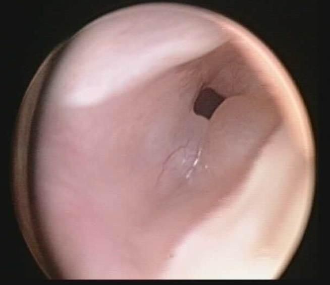 Een 8 maanden oude jongen had sinds 1 week een progressieve, inspiratoire stridor en dyspnoe. Hij was geboren na een zwangerschap van 29 weken en had een geboortegewicht van 1140 g (P40). In de neonatale periode was patiënt 2 maal geïntubeerd en kortdurend beademd. Uit de hetero-anamnese bleek dat zich daarna geen ademhalingsproblemen hadden voorgedaan. Onder verdenking van laryngitis subglottica was in een ander ziekenhuis gestart met budesonide en dexamethason met matig resultaat. In verband met dreigende respiratoire insufficiëntie bij een bovenste luchtwegobstructie werd door de KNO-arts een directe laryngoscopie verricht.