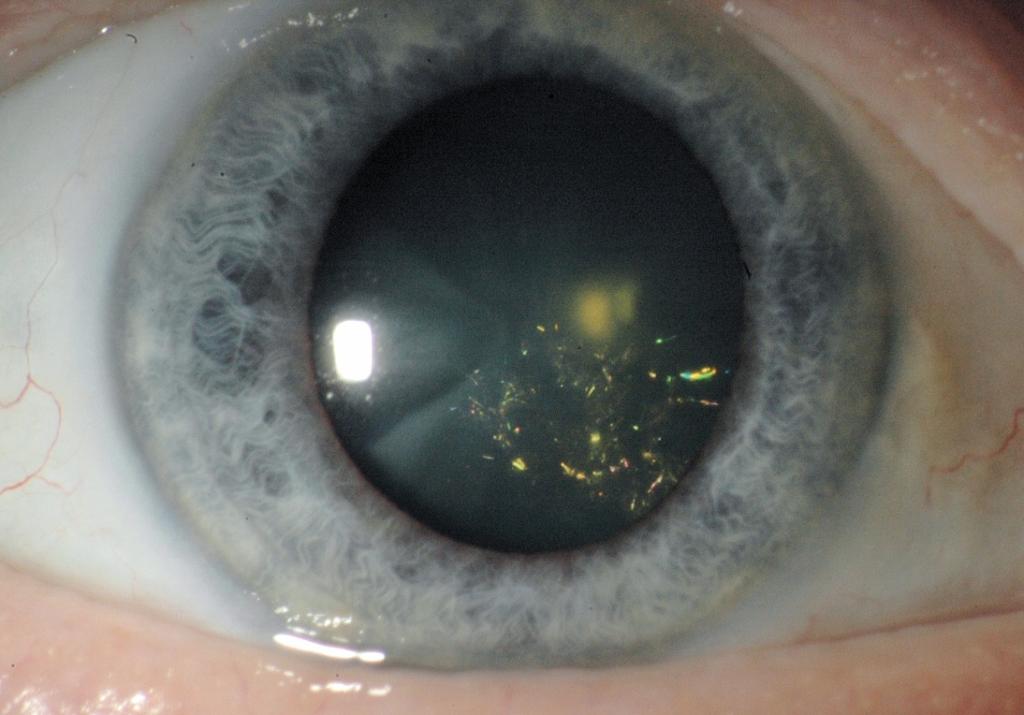 Een 70-jarige vrouw bezocht de polikliniek Oogheelkunde vanwege een geleidelijke visusdaling van het rechter oog, sinds enkele maanden. Bij oogheelkundig onderzoek, met een optimale sferische correctie van +2,50, was de visus rechts 0,7. De intraoculaire druk was 10 mmHg (referentiewaarde: 10-21). Bij spleetlamponderzoek werd een niet-afwijkende voorste oogkamer gezien, het rechter oog toonde een spectaculair palet aan gekleurde naaldvormige opaciteiten. Bij fundoscopie werden geen afwijkingen gevonden.