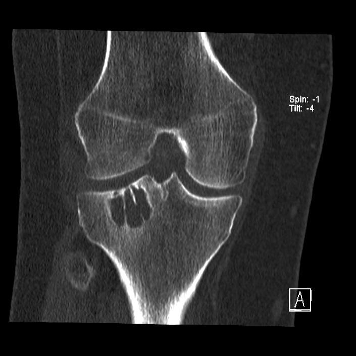Op de SEH kwam een 40-jarige man met een pijnlijke rechter knie nadat hij zich had verstapt. Bij lichamelijk onderzoek viel een pijnlijke zwelling op, die berustte op lokaal oedeem ten gevolge van het ongeval. Ook was er sprake van drukpijn over de laterale zijde van het femur. Flexie in het kniegewricht was beperkt tot maximaal 70 graden. De collaterale ligamenten en de kruisbanden waren intact. Op de röntgenopnamen werd bij toeval een opheldering gezien in het laterale deel van de proximale tibia, waarna een CT-scan werd verricht.