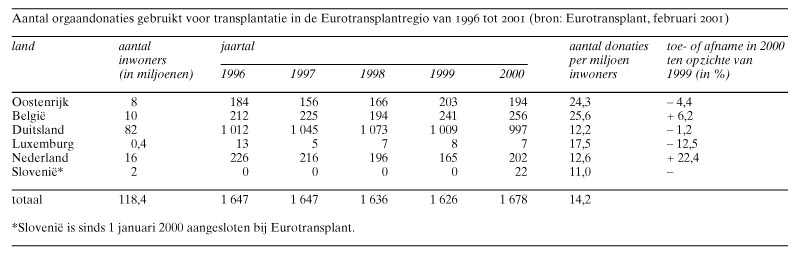 Het aantal orgaandonaties in Nederland heeft zich in 2000 hersteld. Eurotransplant heeft in het afgelopen jaar 202 donororganen geregistreerd en daarmee is het aantal weer terug op het niveau van 1998 (tabel).