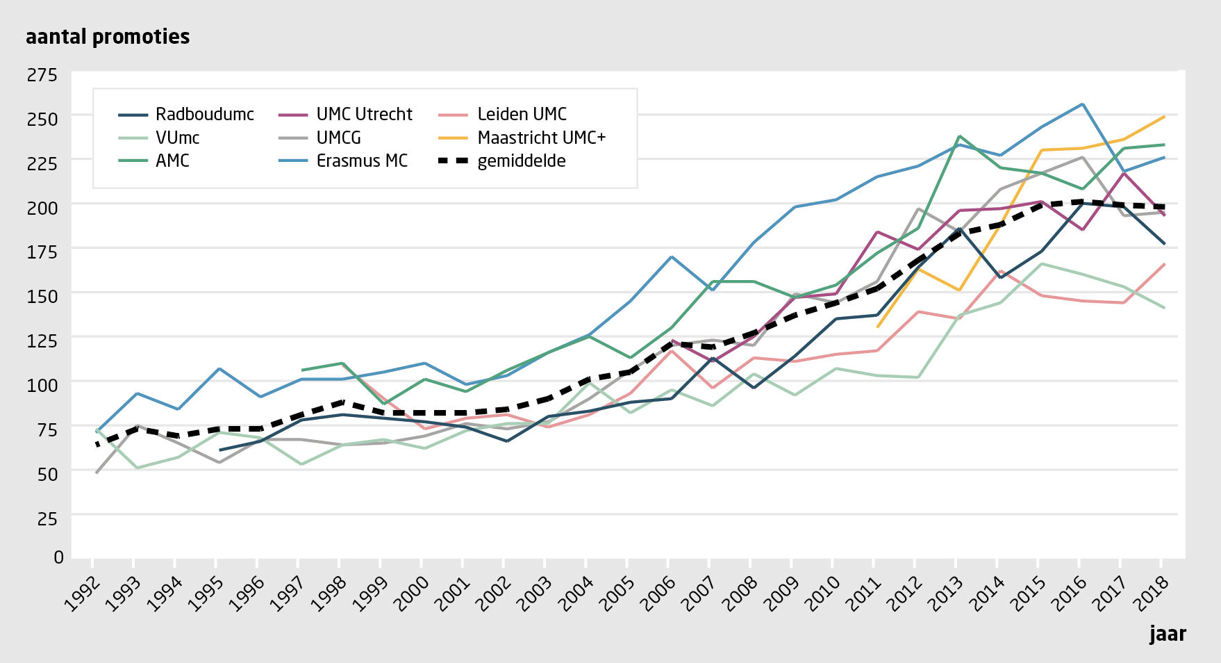 Het gemiddelde jaarlijkse aantal promovendi per medische faculteit nam toe van 64 in 1992 tot 198 in 2018, goeddeels onafhankelijk van de gelijktijdige verruiming van de numerus fixus. De grootste stijging kwam op het conto van vrouwelijke promovendi, die nu 60-65% van de promoties voor hun rekening nemen. Bijna de helft van alle promovendi was medicus. Van de 368 medici die in 2008 promoveerden, had 43% 10 jaar later een aanstelling in een umc, vergelijkbaar voor mannen en vrouwen (oddsratio (95%-BI) voor vrouwen: 1,40 (0,92-2,14)). In de tussenliggende 10 jaar publiceerden deze doctoren mediaan 7 wetenschappelijke publicaties (interkwartielafstand: 2-20), waarvan 1 (0-3) als 1e auteur en 0 (0-2) als laatste auteur. Mannelijke artsen die in 2008 waren gepromoveerd, publiceerden meer dan hun vrouwelijke collega’s (9 (3-27) vs. 6 (2-15) publicaties; p = 0,03), vooral onder academici (23 (11-47) vs. 12 (5-25) publicaties; p = 0,005).
