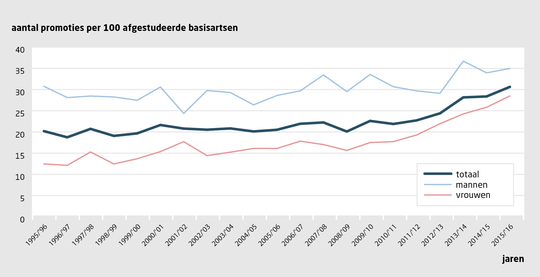 Op landelijk niveau is de stijging van het aantal toegekende doctoraten grotendeels toe te schrijven aan vrouwelijke promovendi, inmiddels bijna 50%.8 Onder geneeskundestudenten zijn vrouwen al sinds 1990 in de meerderheid.9 Hoewel vrouwelijke en mannelijke artsen gelijke ambities hebben,10 blijft de doorstroom van vrouwen naar hogere academische functies achter.11 Zo maakten vrouwen in 2018 23% van de hoogleraren in Nederland uit.11 Het is de vraag of dit een consequentie is van de inherente doorstroomtijd, interesseverschillen weergeeft, of dat gekwalificeerde jonge vrouwen minder kansrijk zijn dan hun mannelijke collega’s. Inzicht in de doorstroom van vrouwelijke artsen naar promotietrajecten én hun perspectieven na het behalen van hun doctoraat is hierbij van waarde, maar gegevens hierover zijn niet voorhanden.