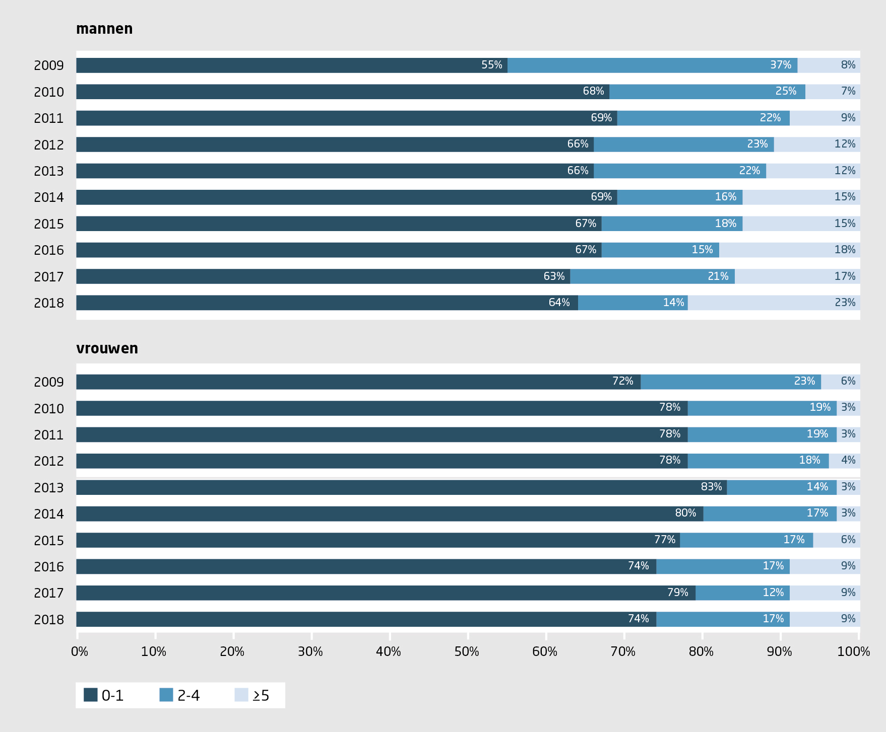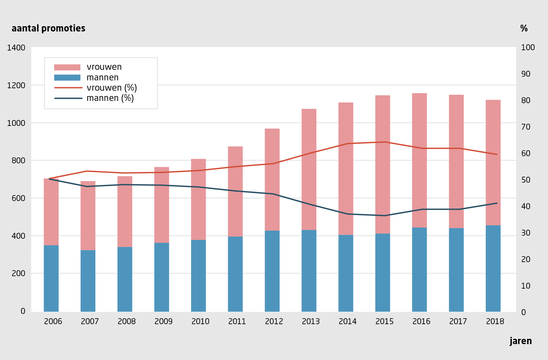 In 2018 verdedigden 1580 promovendi hun dissertatie aan een medische faculteit. Het gemiddelde jaarlijkse aantal promoties per faculteit nam toe van 64 in 1992 tot 198 in 2018 (figuur 1). Van deze promovendi was 43% medicus; dit percentage bleef grofweg onveranderd over de jaren. De stijging van het aantal promoties was niet louter toe te schrijven aan de verruiming van de numerus fixus, aangezien het aantal promovendi per 100 afgestudeerde basisartsen steeg van 20 medio jaren 90 tot meer dan 30 in 2016 (figuur 2). De stijging van het aantal promovendi kwam vooral op het conto van gepromoveerde vrouwen, van wie het aandeel de laatste jaren varieerde van 60-65% (figuur 3).