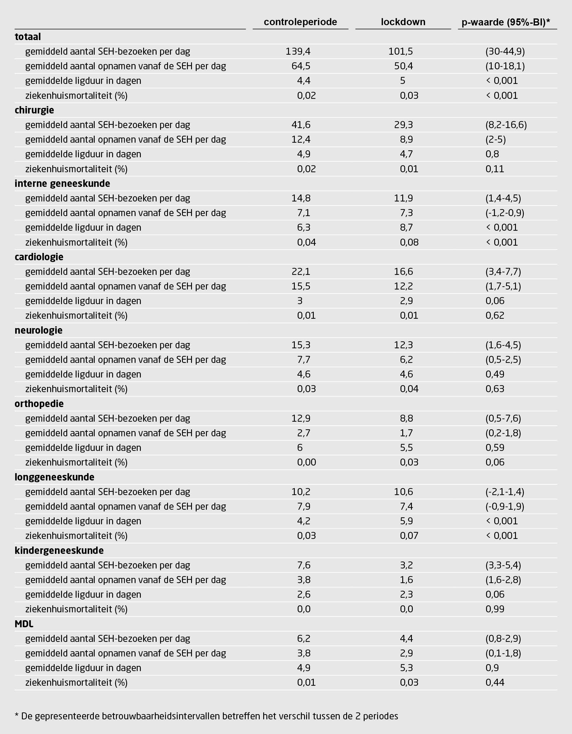 Het aantal SEH-bezoeken daalde tijdens de lockdown met 27%. Voor de specialismen interne geneeskunde en longgeneeskunde waren tijdens de lockdown het aantal opnames vanaf de SEH hetzelfde, maar was de opnameduur langer. Voor alle andere specialismen was tijdens de lockdown het aantal opnames vanaf de SEH lager maar was de opnameduur gelijk. De mortaliteit was hoger en de opnameduur langer voor patiënten die opgenomen waren voor de specialismen interne geneeskunde en longgeneeskunde. Bij alle andere onderzochte specialismen was er geen sprake van een hogere mortaliteit of een langere opnameduur.