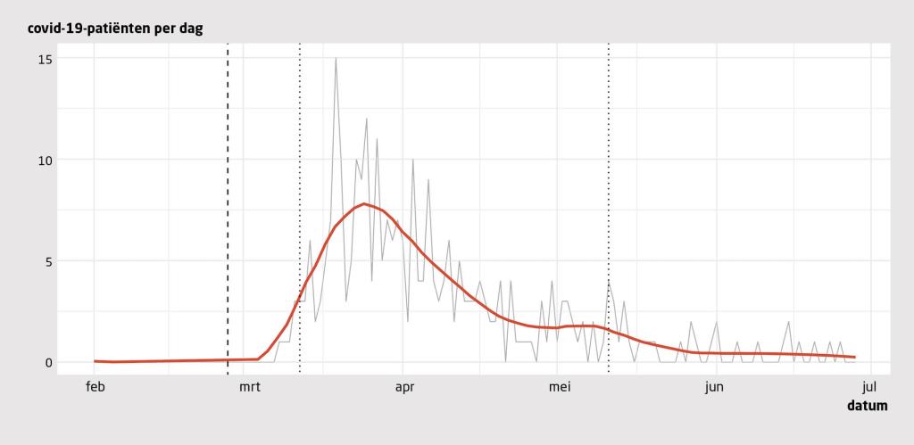 Figuur 2 laat het aantal covid-19-patiënten zien. Aan het begin van de lockdown steeg het aantal covid-19-patiënten op de SEH snel. Deze stijging bereikte 2 weken na de lockdown een maximum. Hierna trad weer een sterke daling op van het aantal patiënten met covid-19 op de SEH.