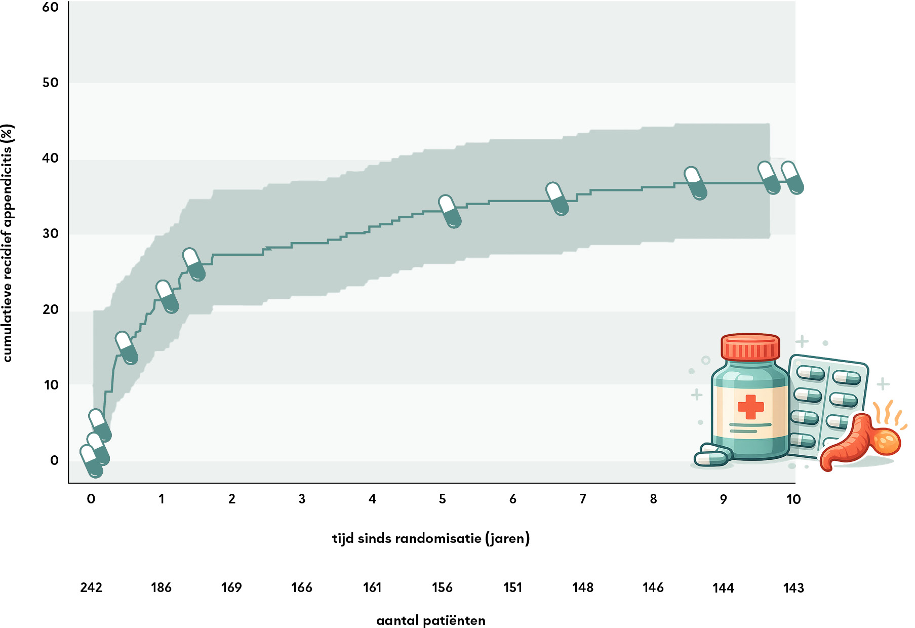 Het merendeel van de recidieven na antibiotische behandeling van ongecompliceerde appendicitis treedt al vroeg op. In de eerste maanden is er een snelle toename van het aantal patiënten dat opnieuw appendicitis ontwikkelt. Na één jaar laat de figuur zien dat ongeveer een kwart een recidief heeft doorgemaakt; daarna neemt het percentage veel geleidelijker toe. Dit wijst erop dat het risico op terugkeer vooral in de beginfase het grootst is, terwijl late recidieven zeldzaam blijven.
