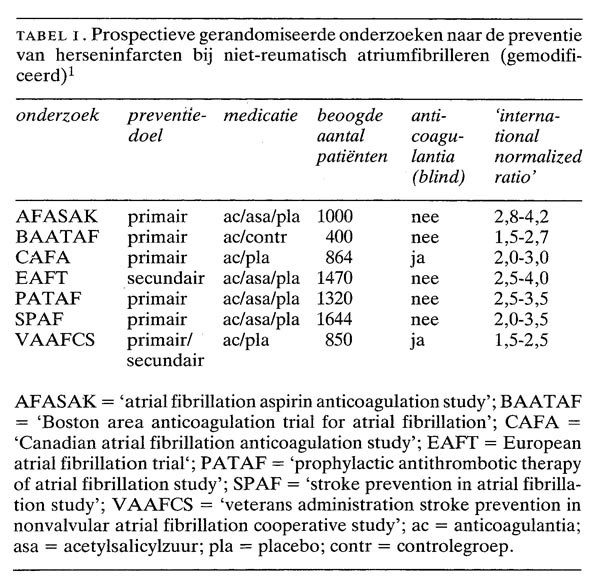 Sinds enige tijd bestaat opnieuw belangstelling voor de vraag of de kans op een (recidief) herseninfarct ten gevolge van een embolus uit het hart bij atriumfibrilleren, verminderd kan worden door gebruik van anticoagulantia. Indien deze vraag bevestigend kan worden beantwoord, moet tevens bepaald worden of het voordeel van deze behandeling opweegt tegen de vergrote kans op soms ernstige bloedingen.
