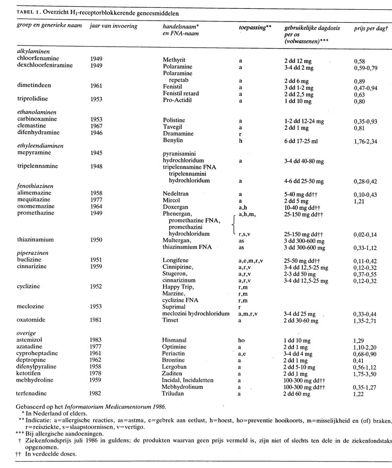De antihistaminica kunnen op grond van hun structuur in een aantal klassen worden ingedeeld. In tabel 1 wordt een overzicht gegeven van de in Nederland verkrijgbare preparaten voor toediening per os. Daarnaast zijn injicieerbare vormen beschikbaar van clemastine (Tavegil), promethazine (Phenergan) en thiazinamium (Multergan). Verder is er een aantal middelen voor uitwendig gebruik en enkele combinatiepreparaten op de markt.