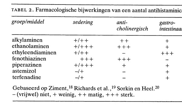 – De belangrijkste bijwerking is depressie van het centrale zenuwstelsel, die tot uiting kan komen in concentratiegebrek, sufheid of slaperigheid. Mogelijk is dit een rechtstreeks gevolg van blokkade van de H1-receptoren in de hersenen. Ook een antiserotonine-effect kan een rol spelen. De gevoeligheid voor deze effecten varieert sterk, zowel inter- als intra-individueel en bovendien komt na enkele dagen vaak gehele of gedeeltelijke tolerantie voor. De verschillende antihistaminica hebben een sterk uiteenlopende sederende werking (tabel 2); sommige worden zelfs als slaapmiddel toegepast. Een aantal nieuwe middelen veroorzaakt veel minder vaak sedering, doordat ze minder goed in de hersenen doordringen (astemizol, terfenadine), of mogelijk minder affiniteit hebben voor centrale H,-receptoren (mequitazine).13 Omdat bij deze middelen niet statistisch significant vaker sufheid voorkomt dan bij placebo worden ze wel als ‘niet-sederend’ aangeduid. Het is echter belangrijk zich te realiseren dat ook bij deze middelen nog steeds circa 10 van de gebruikers last heeft van sedering, soms in ernstige mate. Het verdient daarom aanbeveling om iedere patient aan wie een antihistaminicum wordt voorgeschreven, aan te raden eerst af te wachten hoe hij of zij hierop reageert alvorens potentieel gevaarlijke bezigheden (autorijden!) te ondernemen.