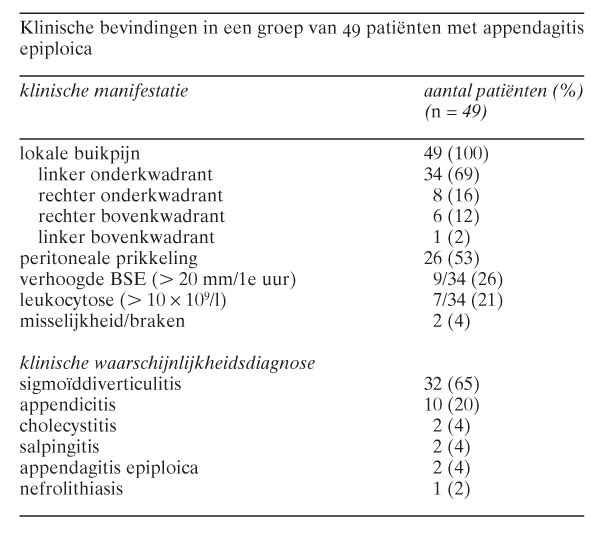 De studiegroep bestond uit 49 patiënten met appendagitis epiploica en was opgebouwd uit 38 mannen en 11 vrouwen, met een mediane leeftijd van 41 jaar (uitersten: 13-73). De klinische bevindingen bij de patiënten staan in de tabel. Alle patiënten hadden klachten van lokale buikpijn, met een mediane periode van 2 dagen tussen het begin van de klachten tot aan het consulteren van een dokter (uitersten: 1-16). De pijn werd aangegeven in het linker onderkwadrant door 34 patiënten (69), in het rechter onderkwadrant door 8 patiënten (16), in het rechter bovenkwadrant door 6 patiënten (12) en in het linker bovenkwadrant door 1 patiënt (2). Behoudens klachten van misselijkheid en braken bij 2 patiënten (4) waren andere klachten afwezig. Geen van de patiënten noemde een duidelijke oorzaak voor de klachten of een luxerende activiteit die voorafging aan de klachten.