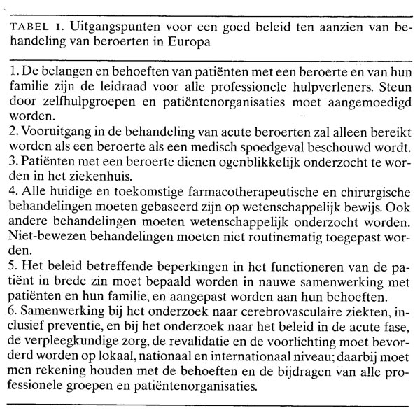 In november 1995 vond in de Zweedse plaats Helsingborg de Pan European Consensus Meeting on Stroke Management plaats over de behandeling van beroerten in Europa. Het was een interdisciplinaire bijeenkomst. Inhoudelijk werd bijgedragen door fysiotherapeuten, geriaters, huisartsen (vooral Britse), internisten, logopedisten, neurologen, revalidatieartsen, verpleegkundigen, en vertegenwoordigers van patiëntenverenigingen en van overheden. De organisatie was in handen van het regionale kantoor voor Europa van de Wereldgezondheidsorganisatie en de European Stroke Council. Er werd samengewerkt met de European Federation of Neurological Societies, de International Stroke Society, de World Confederation for Physical Therapy en de World Federation of Occupational Therapists.12 Werkgroepen hadden tevoren verschillende onderwerpen voorbereid. Tijdens de bijeenkomst werden de documenten in kleine groepen en vervolgens plenair in discussie gebracht. Tijdens de laatste sessie werd een consensusverklaring aangenomen: de ‘Verklaring van Helsingborg betreffende behandeling van beroerten in Europa’. In tabel 1 staan 6…