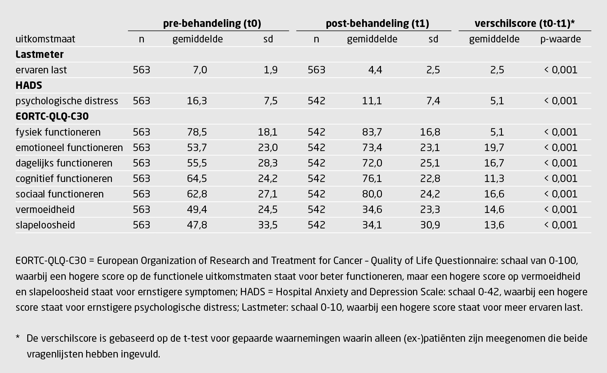 In totaal hebben 563 (ex-)patiënten de behandeling afgerond en pre- en post-behandeling vragenlijsten ingevuld. Gemiddeld volgden zij per traject 11 individuele sessies of groepssessies. Een traject binnen deze studie kostte gemiddeld € 1141. De resultaten van deze behandeling bij kanker lieten een statistisch significante afname (p < 0,001) en klinisch relevante vermindering zien in ervaren last, psychologische distress, vermoeidheid, slapeloosheid en een klinisch relevante verbetering in het functioneren. Ook steeg het percentage patiënten met een score onder de afkapwaarden op de Lastmeter (7% vs 44%) en de HADS (40% vs 66%) gedurende het behandeltraject; ook steeg het percentage patiënten met een goede kwaliteit van leven.