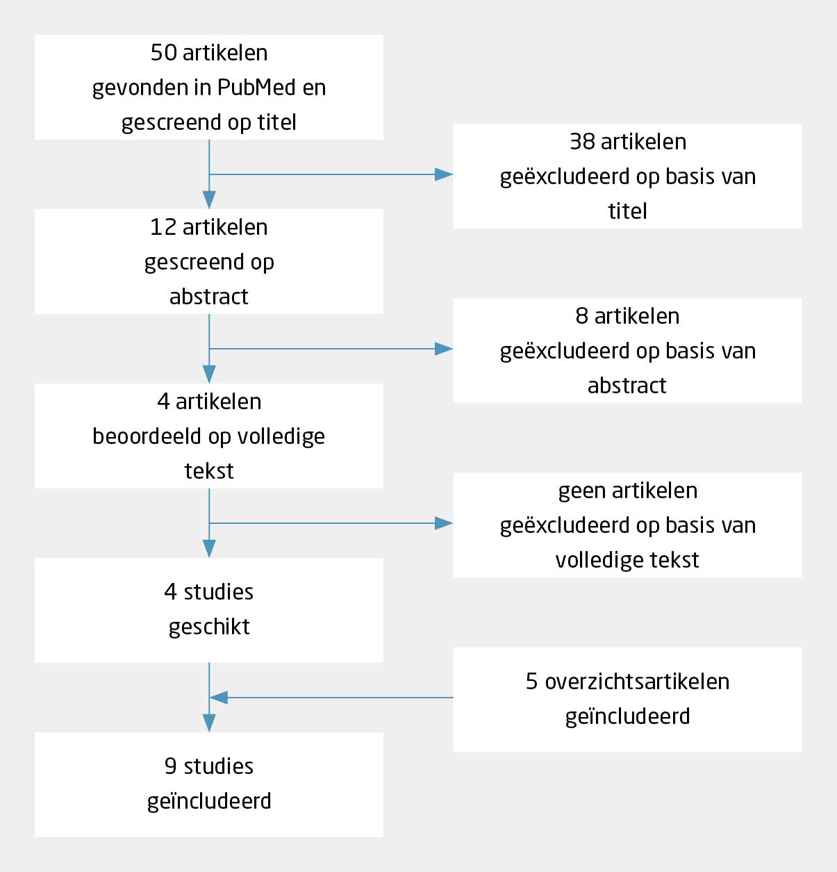 Om antwoord te geven op de vraag of antipsychotica effectief zijn bij het behandelen van een stil delier hebben wij 5 omvangrijke systematische reviews met meta-analyses bestudeerd.9,16-19 Deze 5 overzichtsartikelen bevatten het overgrote deel van de internationale publicaties over de medicamenteuze behandeling van delier tot en met maart 2017. Wij hebben daarnaast nog een extra zoekactie verricht in PubMed met de MESH termen ‘delirium’, ‘medication’ en ‘antipsychotic’ en de term ‘hypoactive delirium’ voor de periode van 1 januari 2017 tot en met 12 maart 2018, om eventuele relevante artikelen op te sporen die verschenen zijn na publicatie van de genoemde overzichtsartikelen. Deze zoekstrategie leverde nog 4 relevante artikelen op.20-23 In totaal hebben wij 9 artikelen meegenomen in dit overzicht: 6 overzichtsartikelen,9,16-19,23 en 3 artikelen van afzonderlijke studies waarin primaire gegevens worden gepresenteerd.20-22 De figuur geeft een overzicht van de zoekstrategie.