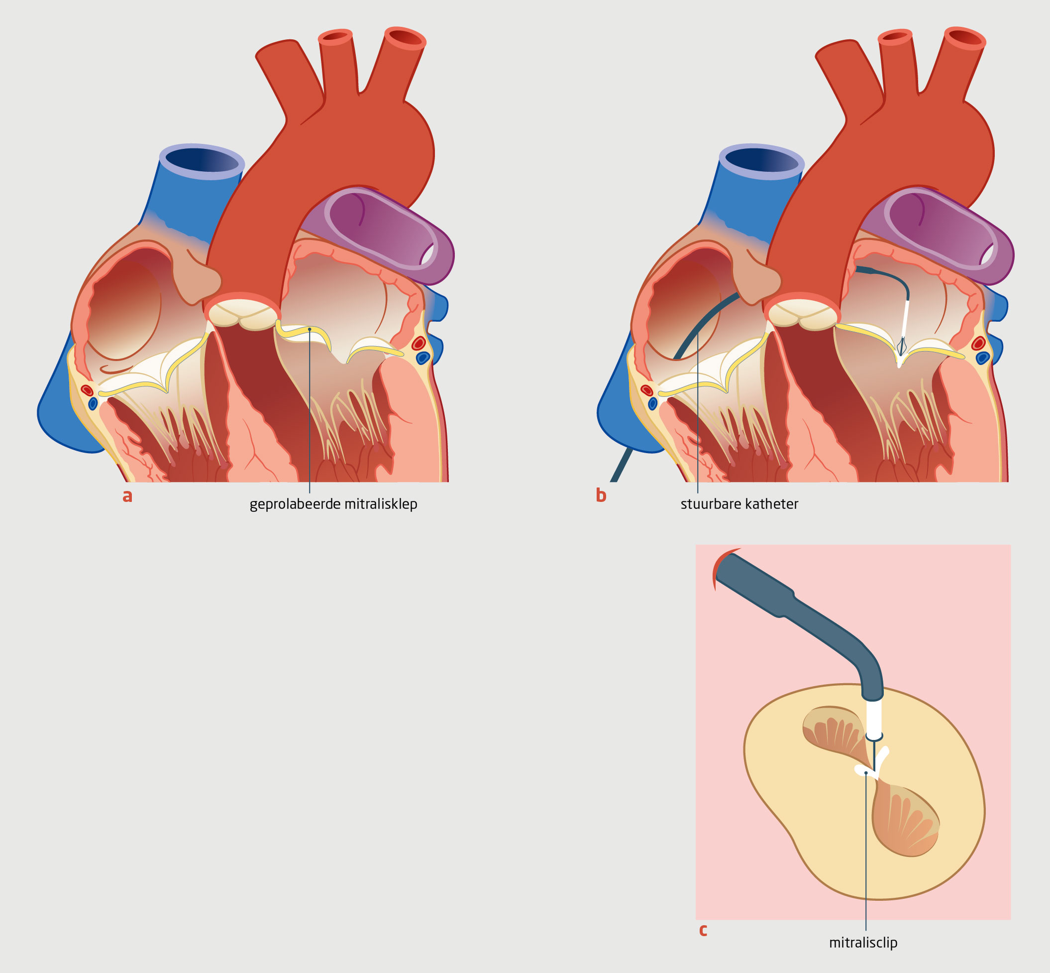 Een cardioloog ziet op de poli een patiënte van 76 jaar. Zij is bekend met hypertensie en heeft als gevolg daarvan cardiomyopathie. Sinds een half jaar is ze toenemend kortademig en ze kan zich steeds minder inspannen. Haar dagelijks functioneren is daardoor achteruitgegaan. Ze is twee keer opgenomen in het ziekenhuis vanwege hartfalen en wordt nu medicamenteus behandeld met lisinopril, metoprolol en furosemide. Op het echocardiogram wordt een linkerventrikelejectiefractie van 25% gezien (referentiewaarde: > 50%) en een ernstige functionele mitralisklepinsufficiëntie. Patiënte heeft nog steeds klachten van kortademigheid. Hoe nu verder?