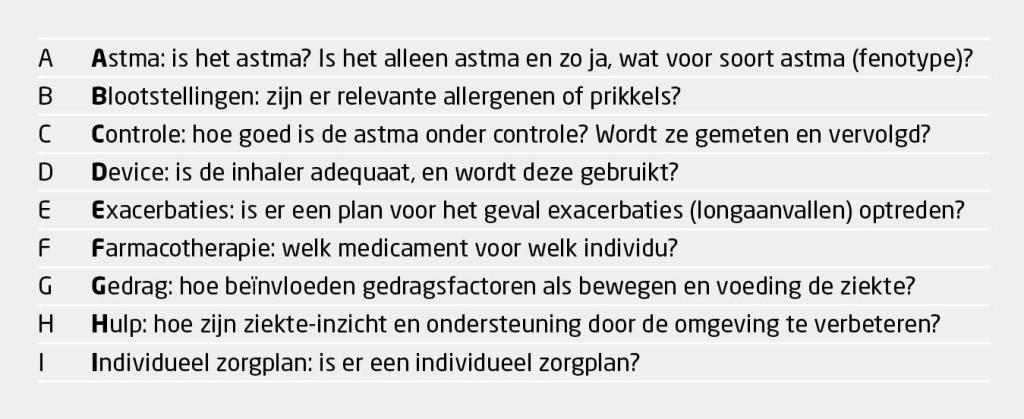 De inzet van dure immuunmodulerende geneesmiddelen bij patiënten met ongecontroleerd astma zonder dat vastgesteld is dat zij ernstig astma hebben, is een behandelstrategie voor luie dokters. Een alfabetisch acroniem (A-I) kan behandelaars in eerste en tweede lijn helpen het onderscheid te maken met een gestructureerde, integrale benadering (tabel).