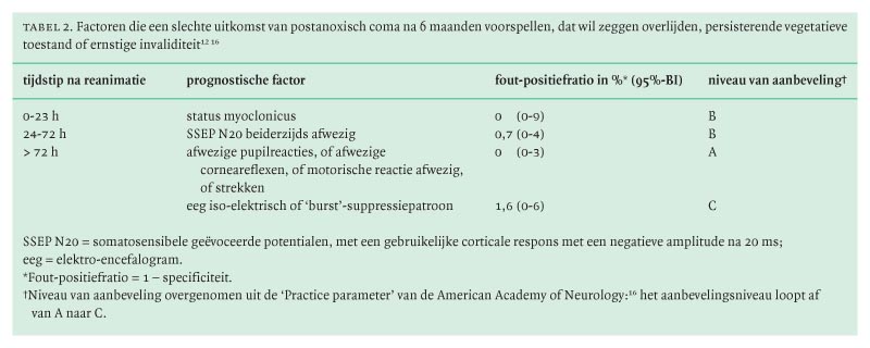 De tests waarmee binnen de eerste 3 dagen na het ontstaan van het coma met een zeer hoge specificiteit een slechte uitkomst voorspeld kan worden, zijn vermeld in tabel 2. Bij ongeveer 80 van de patiënten met een slechte uitkomst kan deze uitkomst in de eerste 3 dagen na de reanimatie met 100 betrouwbaarheid voorspeld worden op grond van het neurologisch onderzoek (status myoclonus, pupilreacties, corneareflexen en motorische reacties), de corticale respons van somatosensibele geëvoceerde potentialen en het eeg.