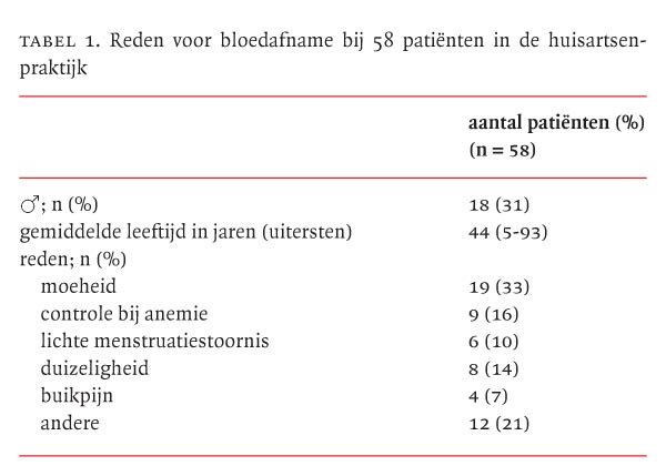 Bij 58 mensen werd zowel een Hb-meting in capillair bloed met de HemoCue in de huisartsenpraktijk als een Hb-meting in veneus bloed in het huisartsenlaboratorium uitgevoerd. In de centra werden in totaal door 11 praktijkassistenten metingen verricht. De reden van de huisarts om een Hb-bepaling in eigen beheer uit te voeren betrof in de meeste gevallen een minder ernstige klacht (tabel 1).