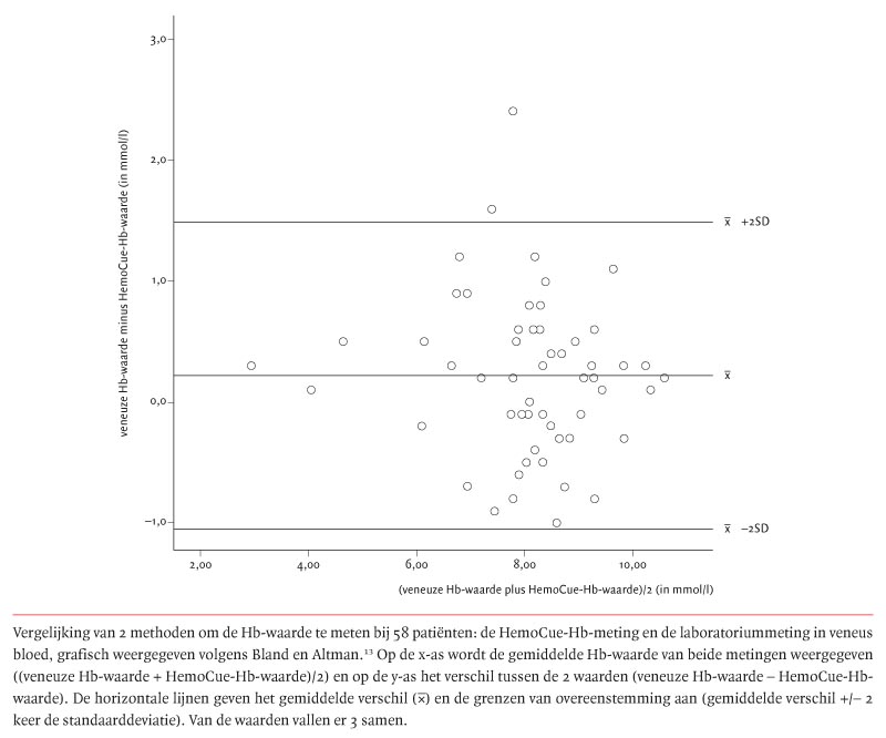 In twee gezondheidscentra werd bij een groep patiënten eerst de Hb-waarde bepaald via een vingerprik met de HemoCue (HemoCue B-Hemoglobin AB photometer, Ängelholm, Zweden) en daarna de veneuze Hb-waarde in het huisartsenlaboratorium. De overeenstemming tussen beide waarden werd berekend volgens de methode van Bland en Altman.