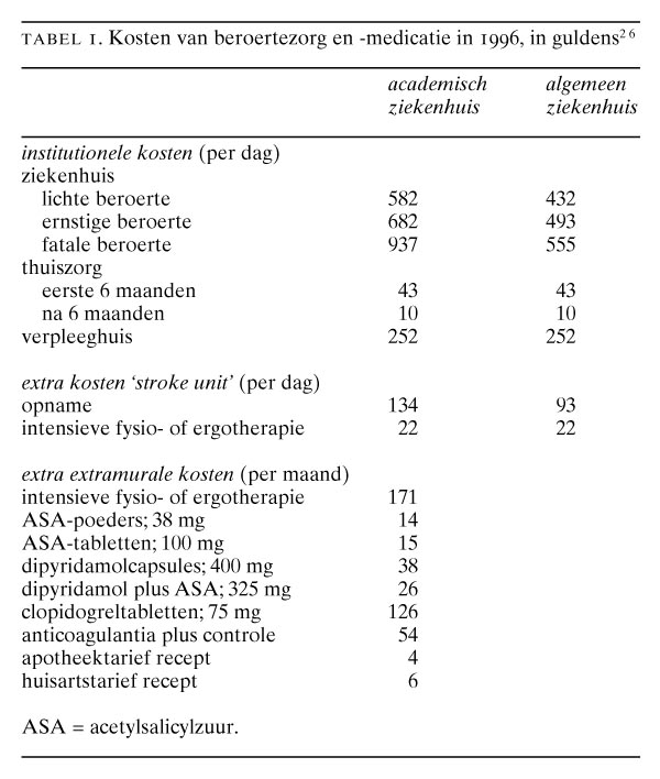 De kosten van de zorg na een ernstige beroerte tot aan overlijden varieerden, afhankelijk van leeftijd en geslacht, tussen de ƒ 84.000 en ƒ 292.000 per patiënt. De kosteneffectiviteit van stroke units nam af met de leeftijd en varieerde tussen ƒ 37.000 en ƒ 60.000, met een tamelijk grote onzekerheidsmarge. Van de 7 opties voor secundaire preventie waren 4 kosteneffectief volgens eerder gebezigde criteria (< ƒ 40.000 per gewonnen levensjaar zonder ernstige ziekte). Acetylsalicylzuur als monotherapie werd als eerste en dipyridamol als tweede optie aanbevolen bij patiënten zonder atriumfibrilleren. Bij de huidige kostprijs was preventie met clopidogrel niet kosteneffectief. Antistolling na een beroerte bij atriumfibrilleren was verhoudingsgewijs kosteneffectief.