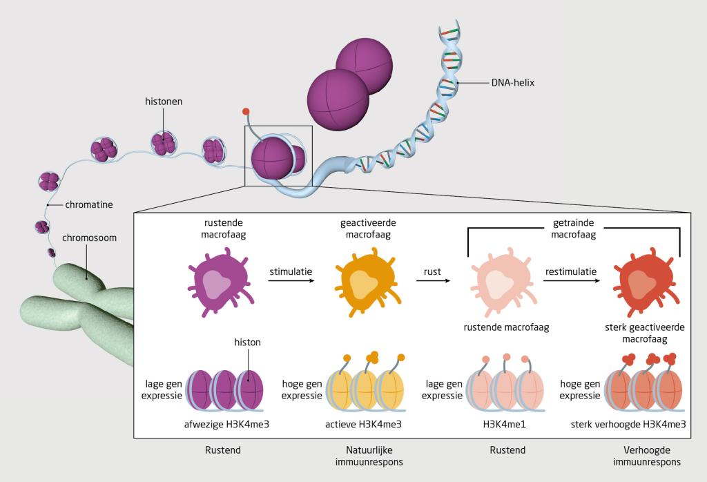 Dit klopt echter niet. Planten en ongewervelde dieren missen een adaptief immuunsysteem, maar beschikken wel over immunologisch geheugen. Het afgelopen decennium is onomstotelijk aangetoond dat de aangeboren afweer ook bij de mens bijdraagt aan het immunologisch geheugen, een mechanisme dat wij ‘trained immunity’ hebben genoemd.2 Wij stuitten hier vrij toevallig op toen we de afweer onderzochten bij studenten die voorafgaand aan een coschap in de tropen gevaccineerd werden met BCG, het bijna 100 jaar oude vaccin tegen tuberculose. Opvallend genoeg bleken immuuncellen van deze studenten na de BCG-vaccinatie niet alleen – zoals verwacht – veel sterker te reageren op antigenen van de tuberkelbacil, maar ook op die van allerlei niet-verwante micro-organismen.3 De cellen produceerden veel meer pro-inflammatoire cytokines. Maanden na de vaccinatie bleken circulerende monocyten van de studenten nog steeds in een verhoogde staat van paraatheid te verkeren, met vlottere gentranscriptie dankzij epigenetische veranderingen van de genen die coderen voor diezelfde pro-inflammatoire cytokines.3