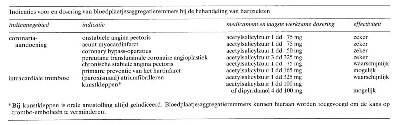 Bloedplaatjesaggregatieremmers hebben reeds jaren hun vaste plaats gekregen in de behandeling van verschillende vormen van hartziekten. Hun rol is bij de behandeling van coronaria-aandoeningen niet meer weg te denken. De belangrijkste indicaties zijn onstabiele angina pectoris en acuut myocardinfarct, al of niet behandeld met trombolyse. Ook patiënten die revascularisatiechirurgie ondergaan, hebben rondom de ingreep en daarna baat bij deze behandeling. Of primaire preventie van de complicaties van coronaria-aandoeningen met bloedplaatjesaggregatieremmers wenselijk is, zal uit lopend onderzoek moeten blijken.