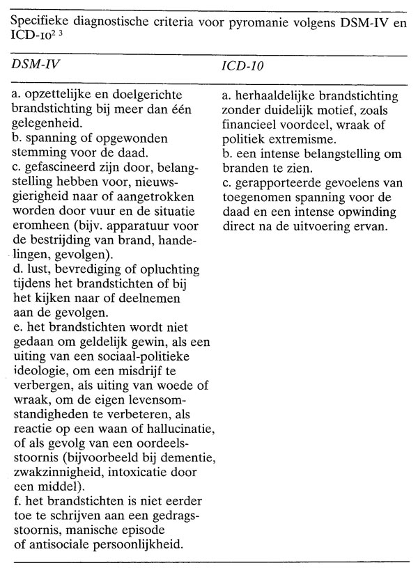 Brandstichting is dus een groot maatschappelijk probleem. In de media meldt men vaak dat er ‘weer een pyromaan’ aan het werk is. Pyromanie is momenteel in de DSM-IV en in de ICD-10 omschreven als een psychiatrische aandoening (tabel).23 Wanneer de brandstichter gearresteerd is, wordt dan ook in de meeste gevallen de districtspsychiater ingeschakeld om na te gaan of er sprake is van een gebrekkige ontwikkeling of ziekelijke stoornis van de geestvermogens. Als dat zo is en er is causaal verband met de brandstichting, dan kan men de dader de brandstichting volgens artikel 39 van het Wetboek van…