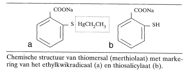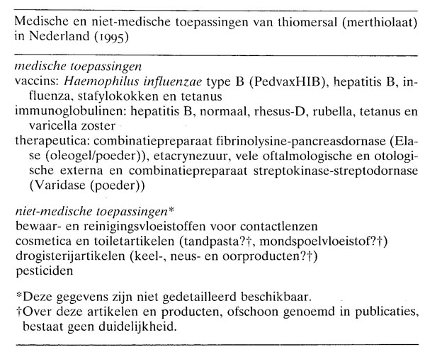 Internationaal variëren de beschikbaarheid en het gebruik van thiomersal-bevattende producten sterk. De toepassingen in Nederland zijn in een overzicht weergegeven (tabel). Hierin valt vooral de toepassing in vaccins, immunoglobulinen, oftalmologische en otologische externa en bewaar-…
