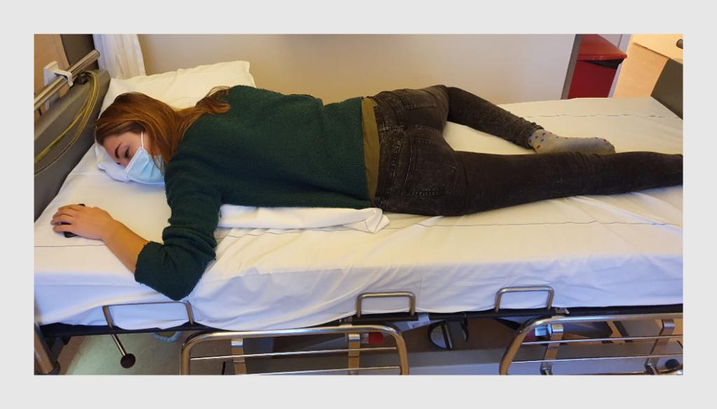 Op de verpleegafdeling legden wij covid-19-patiënten met pulmonale betrokkenheid en een hoge zuurstofbehoefte gedurende wakkere periodes op de buik. Onze hypothese was dat buikligging mogelijk invasieve beademing en een IC-opname voorkomt. Omdat wij bij hen een ernstig ziektebeloop verwachtten, positioneerden wij patiënten met een zuurstofbehoefte ≥ 5 l/min en een ademhalingsfrequentie > 25/min vroegtijdig en consequent in buikligging, waarbij een kussen onder de borstkas werd gelegd en het hoofd werd vrijgehouden (figuur). Om de rug te ontlasten werd één been met de knie in flexie gepositioneerd. Omdat langdurige buikligging niet comfortabel is, maakten wij de pragmatische keuze om buik- en rugligging in blokken van 3 uur af te wisselen en om patiënten ’s nachts op de buik te laten liggen.