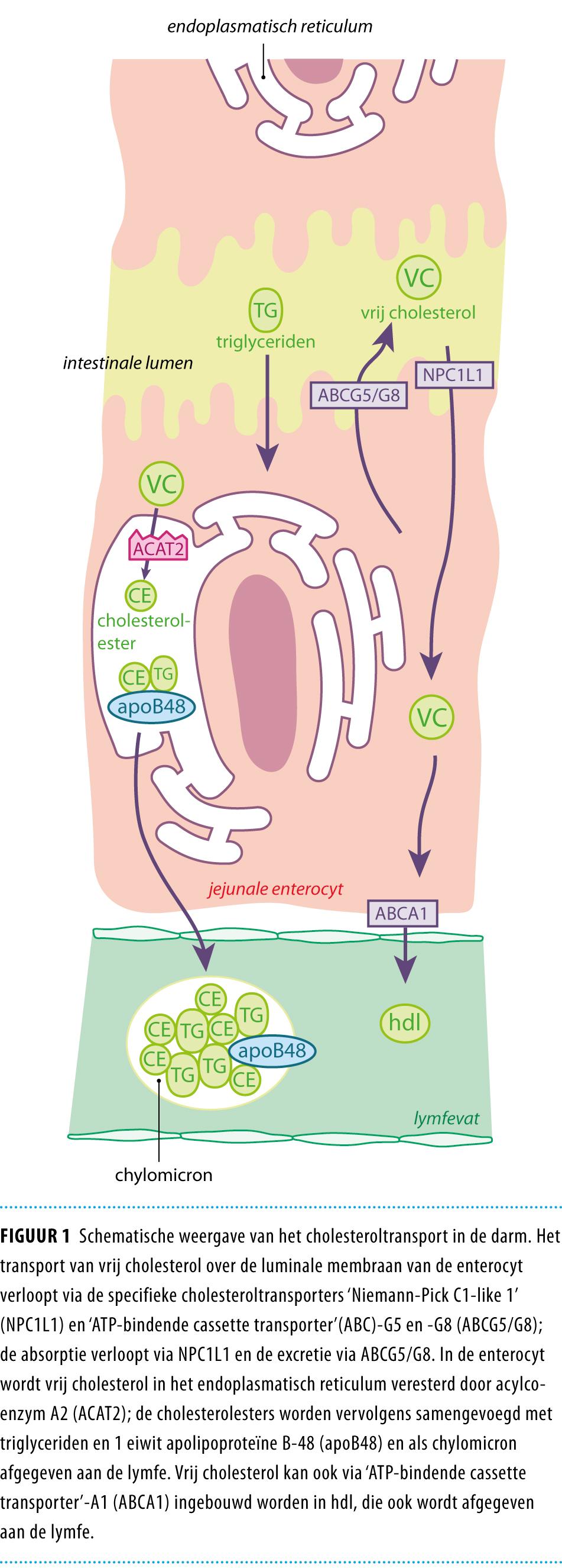 Verlaging van de cholesterolconcentratie met een statine is belangrijk voor het cardiovasculair risicomanagement. De afgelopen jaren is onze kennis van de cholesterolhomeostase toegenomen. Tot voor kort werd verondersteld dat de cholesterolopname in de darm door passieve diffusie tot stand kwam, maar recent zijn specifieke eiwitten ontdekt die de functie hebben van cholesteroltransporter. Veel van het onderzoek is verricht bij proefdieren, maar inmiddels zijn ook bij patiënten ziektebeelden beschreven met stoornissen in het enterale cholesteroltransport.