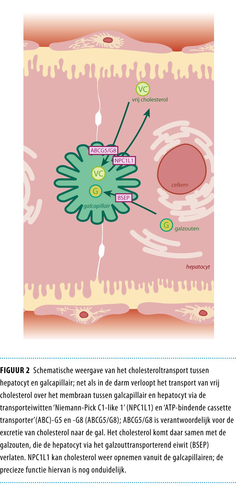 Patiënten met sitosterolemie die de transporteiwitten ABCG5/G8 missen, hebben dan ook een verminderde biliaire cholesterolexcretie.5 Tot voor kort werd gedacht dat de biliaire excretie van cholesterol vooral afhankelijk was van galzouten en fosfolipiden, maar nu is duidelijk geworden dat deze afhankelijk is van bovengenoemde specifieke transporters.