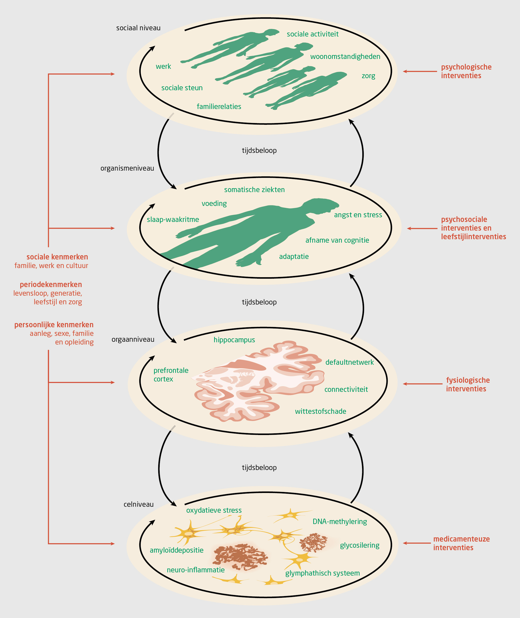 Deze complexe verbanden tussen cellulaire schademechanismen, structurele hersenschade en het gedrag van het individu in interactie met zijn omgeving, laten zich veel beter verklaren door de hersenen als een CAS te beschouwen, met interacties binnen en tussen verschillende niveaus. De neuronale schade interacteert met de functies van de hersenen, de activiteiten van de persoon en diens sociale gedrag (figuur 1). Analoog hieraan is de beschrijving van de complexe pathofysiologie van dementie door herhaaldelijke hersenschuddingen bij mensen die een contactsport beoefenen.17 De complexe interacties bevinden zich in beide gevallen op verschillende ruimtelijke niveaus (van microscopisch tot macroscopisch) en in verschillende tijdschalen (van zeer snel voor de cellulaire processen tot zeer langzaam voor de verandering in cognitieve functies).