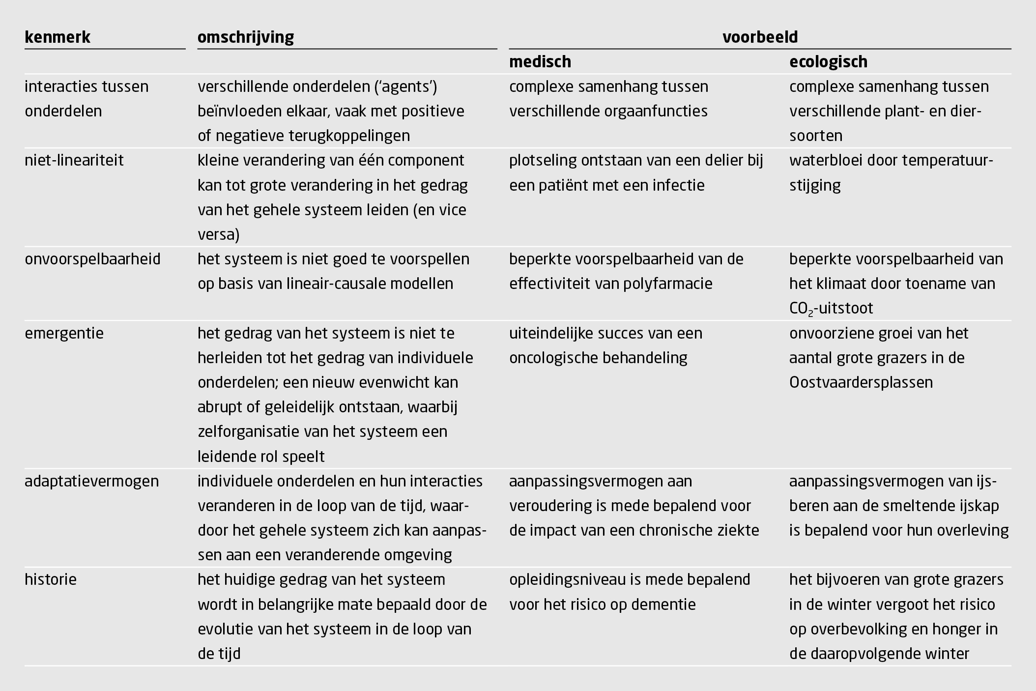 Complexe systemen zijn evolutionair gezien een logische ontwikkeling, omdat ze hun gedrag kunnen aanpassen aan veranderingen in de omgeving en ‘adaptief’ zijn. Een systeem dat zich zo gedraagt en evolueert noemen we een ‘complex adaptief systeem’ (CAS).7 In tabel 1 staan de belangrijkste kenmerken van een CAS.5 Hoewel de voorspelbaarheid van een CAS per definitie beperkt is, kunnen de uitkomsten van interventies in het systeem achteraf vaak wel verklaard of begrepen worden. Niet alleen de patiënt als geheel, maar ook de netwerken van organen, weefsels en cellen zijn een CAS. Een CAS is een open systeem dat continu energie verbruikt om intern te zorgen voor voldoende orde. Hiermee onderscheidt een CAS zich van gesloten chemische of natuurkundige systemen. Levende materie zou als gesloten systeem snel ten onder gaan aan de tweede hoofdwet van de thermodynamica, die toename van entropie en dus verlies van orde voorschrijft. Het cruciale dynamische proces van homeostase, dat juist het interne milieu bewaakt, is afhankelijk van ‘homeokinese’ in complexe open systemen: door energieverbruik wordt buiten het systeem een toename van entropie gerealiseerd, terwijl deze intern constant blijft.8