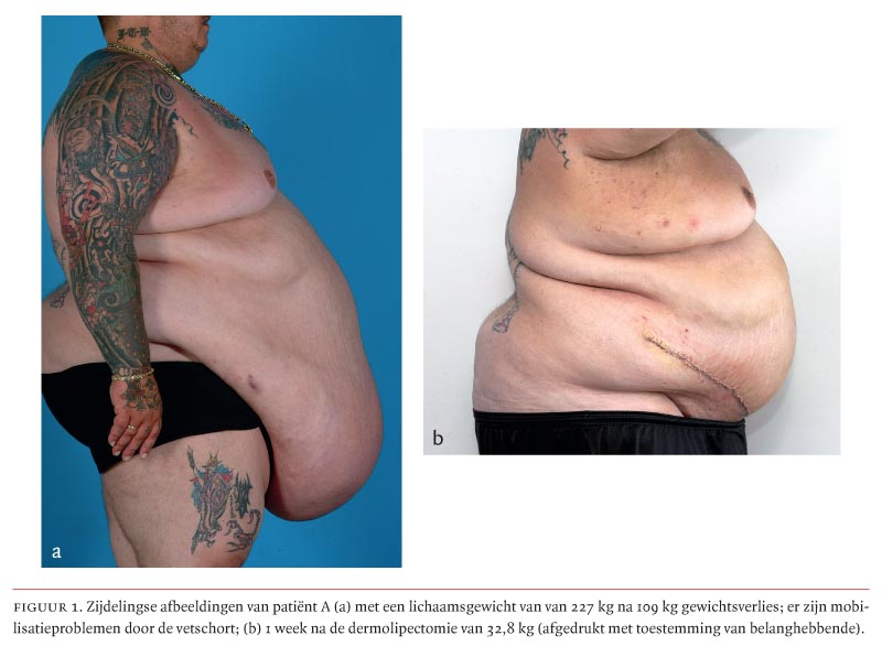 Een 42-jarige man werd verwezen naar de polikliniek Plastische Chirurgie in verband met een verzoek tot contourcorrectie na eerdere bariatrische chirurgie elders. Hij was dankzij deze bariatrische ingrepen 109 kg afgevallen naar 227 kg. Bij dit stabiele gewicht had hij een groot abdominaal huidsurplus met functionele beperkingen en ontsteking door smetten. Na behandeling van zijn comorbiditeit voerden wij tenslotte een uitgebreide abdominale dermolipectomie uit en excideerden wij een huidsurplus met een gewicht van 32,8 kg. Er was tijdelijk postoperatieve wonddehiscentie, die wij conservatief behandelden. Patiënt was zeer tevreden over de sterke verbetering van zijn lichaamscontour.