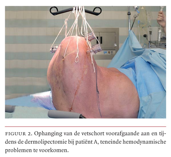 Bij de operatie werd, met de patiënt in rugligging, het centrale deel van het abdomen gedurende 1 h opgehangen aan een steriele constructie, zodat bloed en weefselvocht door de zwaartekracht vanuit de vetschort in het lichaam konden worden opgenomen (figuur 2). Zo kon onnodig bloed- en vochtverlies gedurende de ingreep worden tegengegaan en de kans op grote hemodynamische shifts worden beperkt. Daarna voerden wij door middel van een grote wigexcisie een uitgebreide abdominale dermolipectomie uit, waarbij wij een huidsurplus met een gewicht van 32,8 kg excideerden. De totale anesthesieduur bedroeg 388 min. Na de operatie verbleef patiënt 1 nacht op de intensivecare-unit, waarna hij 16 dagen op de afdeling verbleef. Als enige complicatie had hij na 2 weken een wonddehiscentie over 15 cm, die met vacuümtherapie en wondverbanden over een periode van enkele weken per secundam genas. Patiënt was na de operatie erg blij met het resultaat en de sterk toegenomen bewegingsvrijheid (zie figuur 1b).